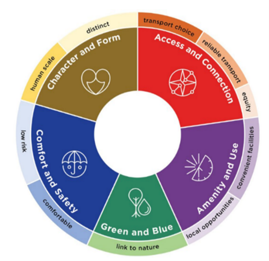 The 10 built environment performance outcomes for evaluating movement and place projects across 5 themes. Source: NSW Government