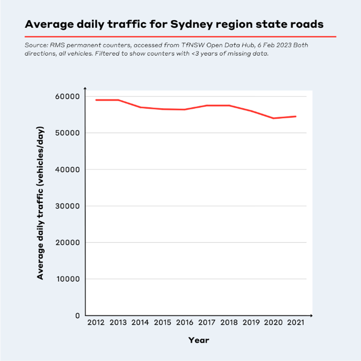 Conventional traffic forecasting presumes inevitable growth in vehicle movements. Yet as the table below shows, the data tells a different story for Greater Sydney's arterial roads, where average daily traffic volumes have dropped by around 20 per cent over the decade to 2021. ‘Peak car’ travel occurred in 2004 across all our major cities, meaning that the average Australian is travelling less by car every year and this trend is continuing downwards. By challenging the continuous upward trajectory of traffic growth, we can reconsider the necessity of building more road infrastructure with embodied carbon and materials. It's a call to align our planning with the evolving realities of urban mobility, ensuring that our investments are both sustainable and responsive to actual transport trends.